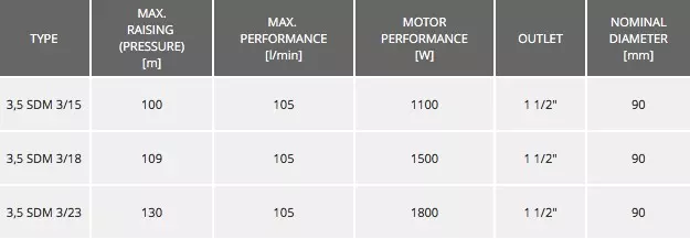 Mehrstufige Tauchpumpen mit einem Durchmesser von 90 mm. Aufgrund der bewährten Konstruktion ist es die wirtschaftlichste Lösung für Einfamilienhäuser und Bauernhöfe. Dank des kleinen Durchmessers, des Kondensators im Motor und des werkseitigen Anschlusses des 18 m langen Kabels ist die Pumpe sofort nach dem Auspacken einbaufertig. Pumpen erhältlich in der Version 230 V ~ /50 Hz und 400 V ~ 3/50 Hz. Die Pumpen in einphasigen Version sind mit einem in der Motorwicklung montierten Wärmeschutz ausgestattet.