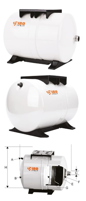 Horizontale Membrantanks mit nicht austauschbaren Membranen zur Verwendung mit Trinkwasser. Die Tanks haben einen Boden und Beine aus Kunststoff, wodurch das Risiko einer Pumpenräsonierung auf ein Minimum reduziert wurde. Tanks in den Größen 24, 50, 80, 100 Liter erhältlich. Im Inneren des Stahlbehälters befindet sich eine nicht austauschbare Membran aus BUTYL, die sich durch hohe Zugfestigkeit und Beständigkeit gegen hohe Temperaturen auszeichnet und die Flüssigkeit vom Raum der Luft trennt.