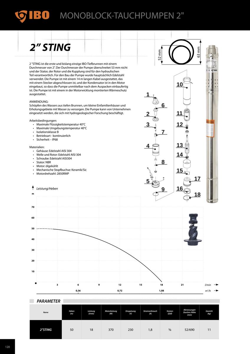 2 "STING ist die erste und bislang einzige IBO-Tiefbrunnen mit einem Durchmesser von 2". Der Durchmesser der Pumpe überschreitet 53 mm nicht und der Stator, der Rotor und die Kupplung sind für den hydraulischen Teil verantwortlich. Für den Bau der Pumpe wurde hauptsächlich Edelstahl verwendet. Die Pumpe ist mit einem 14 m langen Kabel ausgestattet, das mit einem Stecker abgeschlossen ist, und der Kondensator ist in den Motor eingebaut, so dass die Pumpe unmittelbar nach dem Auspacken einbaufertig ist. Die Pumpe ist mit einem in der Motorwicklung montierten Wärmeschutz ausgestattet.